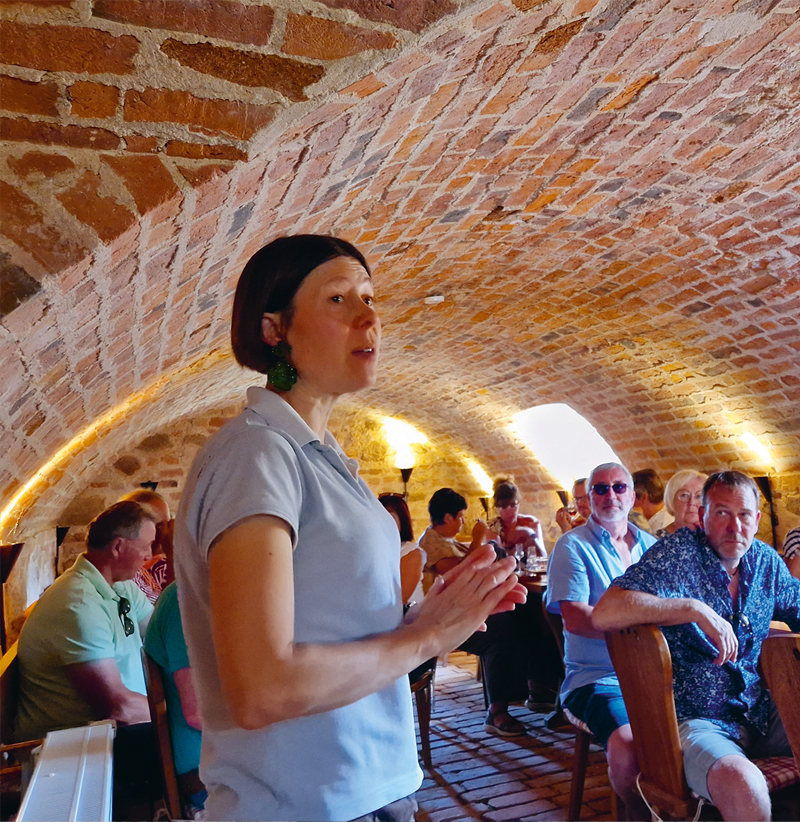 In den Kellergewölben ist die Manufaktur und der Verkostungsbereich des Likörs „Alte Pomeranze“ eingezogen. Die Hahns konnten ein altes Familienrezept übernehmen und begannen mit der Produktion und dem Verkauf des Bitterlikörs in der Burg. Einst waren die kleinen bittersüßen Früchte, der „goldene Apfel“, eine Spezialität europäischer Fürstenhäuser, weil die Pomeranze nur in Orangerien überwintern konnte. Sie geriet zunehmend in Vergessenheit und überlebte nur im Begriff „Landpomeranze“. Verena Hahn hat sie aus dem Dornröschenschlaf geweckt und vertreibt den Likör jetzt erfolgreich auch in Geschäften und in ihrem Onlineshop. „Wir haben ein Jahr getüftelt, bis das Design sowie Marketing- und Vertriebskonzept standen.“ Es hat sich gelohnt. Die Produktion war von Anfang an profitabel, obwohl der gesamte Produktionsprozess von Hand gemacht werden muss. Neben der Produktion und der Vermarktung der „Alten Pomeranze“ arbeitet Verena Hahn, studierte Betriebswirtin, auch als Fundraiserin für das Christliche Soziale Jugenddorfwerk e.V. (CJD) in Mecklenburg.